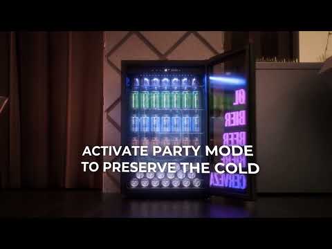 Beer fridge La Sommelière BEER150: professional temperature range from -6 to +18 °C, capacity for up to 153 cans, fully customizable backlit door and touch controls for fast, precise cooling.